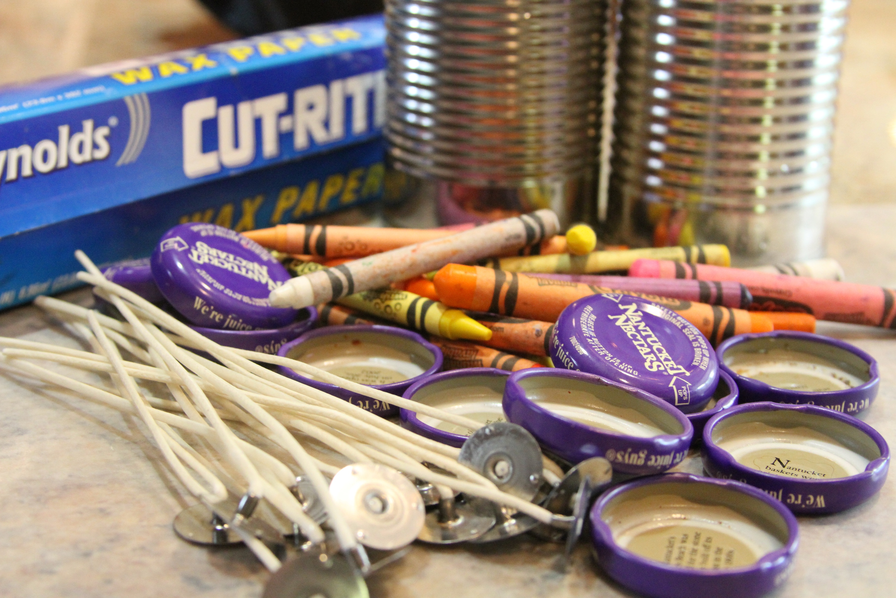 Supplies: Nantucket Nectars lids, crayons, pre-waxed wicks, empty tin cans, scissors, waxed paper (optional).